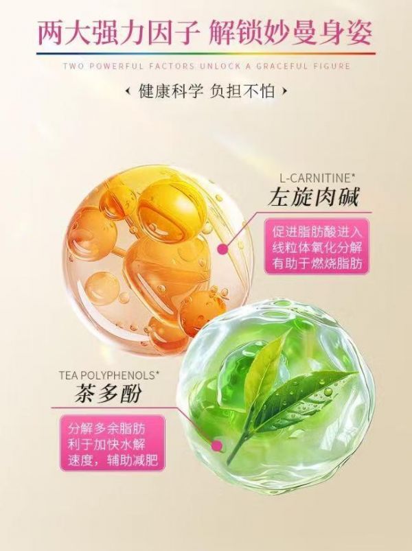 - 攔截吸收+加速燃燒: 茶多酚抑制碳水吸收,直接減少新脂肪合成原料;左旋肉堿強(qiáng)力燃燒已有脂肪庫(kù)存,雙路徑夾擊脂肪。