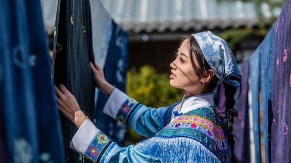 白族扎染技藝傳承人段銀妹(左)和手工藝人段利蘭在周城村“璞真染坊”拆花(11月21日攝)。白族扎染以板藍根為主要染料,工序包含繪圖、制版、印花、扎花、染色、漂洗、拆花、晾曬等。