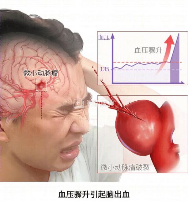 大腦內(nèi)的小血管硬化,在長(zhǎng)期高血壓的影響下,血管壁變得像玻璃一樣脆,而且越來(lái)越薄。一旦血壓突然升高(比如酗酒、生氣、熬夜工作等),就容易破裂,進(jìn)而導(dǎo)致腦出血。