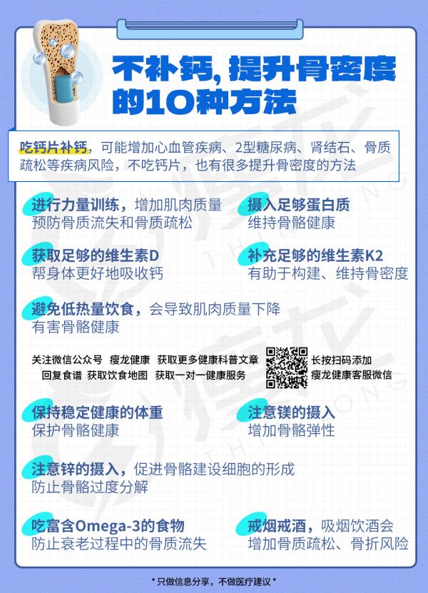 吃鈣片補(bǔ)鈣,可能增加心血管疾病、2型糖尿病、腎結(jié)石、骨質(zhì)疏松等疾病風(fēng)險(xiǎn),不吃鈣片,也有很多提升骨密度的方法