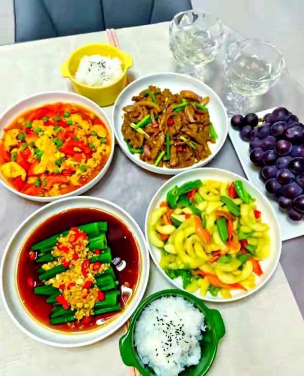 周一的晚餐以清爽健康為主,搭配洋蔥炒牛肉、西紅柿炒雞蛋、清炒老黃瓜與白灼秋葵,開啟一周的健康之旅。