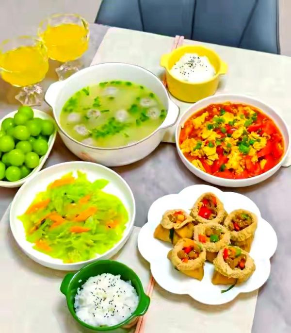 周二晚餐的菜品豐富多樣,包括冬瓜肉丸湯、福袋牛肉粒、素炒萵筍以及西紅柿炒雞蛋。