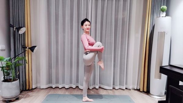 這個動作哪怕在平時沒有墊子的情況下也可以完成,首先我們站立在地面,保持脊柱的挺直 然后屈右膝,手抓右腳踝,輔助右腳踝放在左大腿根部,然后放開雙手,讓右腳掌和左大腿同時用力,髖部始終面向前方,雙手合十舉過頭頂,保持身體平衡。這個動作能夠緊實胸背肌肉,增加肌肉耐力,而且有助于我們集中注意力。