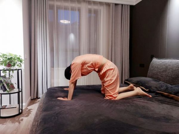 這個動作只需要把自己當(dāng)成一只貓咪在伸懶腰即可,一開始我們保持跪姿,大腿與小腿呈直角,手掌于肩膀下方撐地,手臂于地面垂直。吸氣的時候臀部抬高,腰往下塌,頭部抬起,讓自己的背部呈一個弧形。呼氣的時候從腹部開始往上拱,一節(jié)一節(jié)活動往上頂直到到達胸腔,把背部拱到最高處,頭往下垂。最后把臀部向上抬,然后垂下肩膀,讓整個手臂貼著地面,用肚子找大腿,但是同時保持大腿于地面的垂直,頭部微抬,平視前方。這個動作能夠增加脊椎骨的靈活性,緩解背部疼痛,充分地伸張了胳臂和背部,促進血液循環(huán)。