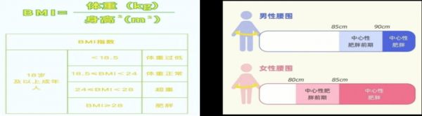 臨床上采用BMI作為判斷肥胖的常用簡(jiǎn)易指標(biāo)。BMI(kg/m2)= 體重(kg)/身高2(m2)。此外,測(cè)量腰圍也可以診斷中心型肥胖和周?chē)头逝帧?/p>