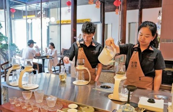在黃山毛峰、太平猴魁、祁門紅茶的發(fā)源地——安徽省黃山市,一種名為“新中式調飲”的飲茶新方式在當?shù)厍娜慌d起。圖為黃山市屯溪區(qū)一處茶空間,店員制作新式茶飲。新華社