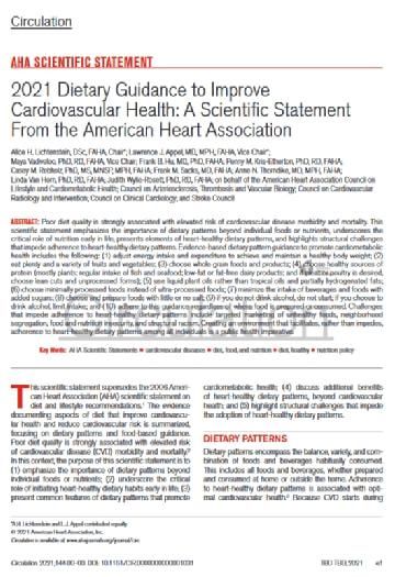 Lichtenstein, A. H., Appel, L. J., Vadiveloo, M., Hu, F. B., Kris-Etherton, P. M., Rebholz, C. M., Sacks, F. M., Thorndike, A. N., Van Horn, L., Wylie-Rosett, J., & American Heart Association Council on Lifestyle and Cardiometabolic Health; Council on Arteriosclerosis, Thrombosis and Vascular Biology; Council on Cardiovascular Radiology and Intervention; Council on Clinical Cardiology; and Stroke Council (2021). 2021 Dietary Guidance to Improve Cardiovascular Health: A Scientific Statement From the American Heart Association. Circulation, CIR0000000000001031. Advance online publication. https://doi.org/10.1161/CIR.0000000000001031