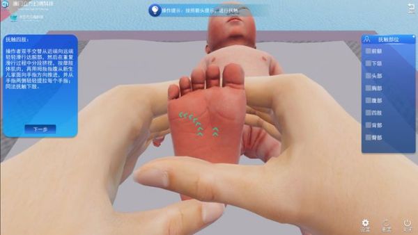 新生兒撫觸虛擬仿真教學(xué)系統(tǒng)通過(guò)先進(jìn)的建模技術(shù),真實(shí)還原新生兒的皮膚質(zhì)感、生理反應(yīng)及解剖特征。學(xué)生可以在仿真環(huán)境中完整體驗(yàn)撫觸的全流程,包括頭部、四肢、腹部等不同部位的操作。