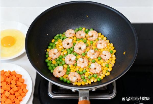 做法:蝦仁用料酒和白胡椒粉腌制 10 分鐘,胡蘿卜切丁,雞蛋炒散備用。熱油炒香蝦仁至變色盛出,再炒胡蘿卜和玉米 2 分鐘,倒入米飯炒散,加蝦仁和雞蛋,少許鹽調(diào)味即可。