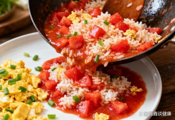 做法:番茄頂部劃十字燙去皮,切丁備用,雞蛋炒散盛出。熱油炒香番茄丁,加半勺白糖炒出濃汁,倒入米飯壓散,讓每粒米飯都裹上番茄汁,加入雞蛋碎和鹽,翻炒均勻撒蔥花即可。