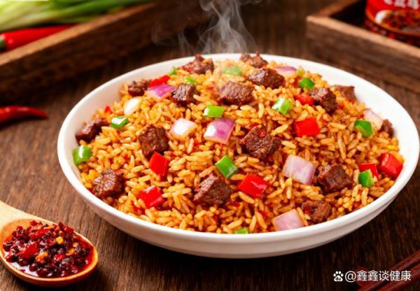 做法:牛肉切丁,洋蔥和青紅椒切丁,雞蛋炒散備用。熱油爆香洋蔥丁,加入牛肉丁翻炒 1 分鐘,放入青紅椒丁炒至斷生,倒入米飯炒散,加老干媽和生抽,大火快炒均勻,出鍋前撒蔥花。