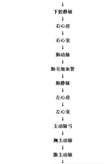 接圖一:門靜脈→下腔靜脈→右心房→右心室→肺動脈→肺毛細(xì)血管→肺靜脈→左心房→左心室→主動脈弓→胸主動脈→腹主動脈。