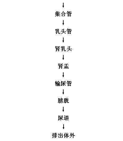 接圖三:遠(yuǎn)曲小管→集合管→乳頭管→腎乳頭→腎盂→輸尿管→膀胱→尿道→排除體外。