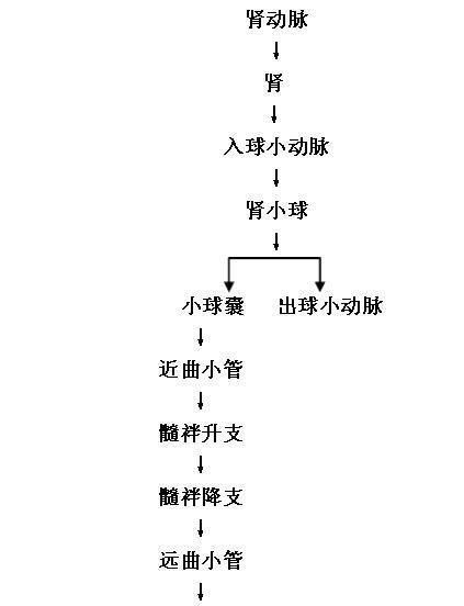 接圖二:腹主動脈→腎動脈→腎→入球小動脈→腎小球→小球囊(出球小動脈)→近曲小管→髓袢升支→髓袢降支→遠(yuǎn)曲小管。