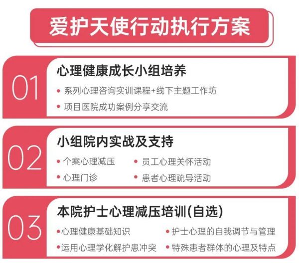 愛護(hù)天使行動(dòng)是燈塔計(jì)劃的基礎(chǔ),由中國研究型醫(yī)院學(xué)會(huì)護(hù)理分會(huì)聯(lián)合心理健康專家實(shí)施。護(hù)理部為主導(dǎo)、心理專家為指導(dǎo),為醫(yī)院搭建護(hù)士心理解壓站并制定年度活動(dòng)計(jì)劃,通過心理咨詢實(shí)訓(xùn)、線下主題工作坊組建 10-15 人的心理健康成長小組,同步開展員工心理關(guān)懷與患者心理疏導(dǎo)活動(dòng)。全體護(hù)士可自選心理減壓培訓(xùn)(含自我調(diào)節(jié)管理、特殊患者心理特點(diǎn)等內(nèi)容),提升護(hù)士職業(yè)幸福感與患者滿意度。