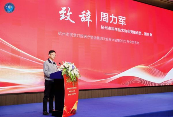 杭州市科學技術協(xié)會黨組成員、副主席周力軍代表業(yè)務主管單位致辭,對大會的勝利召開和新當選的領導班子表示熱烈祝賀。他充分肯定了協(xié)會過往的工作成績,并對協(xié)會未來發(fā)展提出殷切期望:要堅持正確政治方向,服務健康杭州大局;聚焦科技賦能與行業(yè)規(guī)范,搭建高水平交流平臺;強化自身建設,提升服務效能,將協(xié)會真正打造成“會員之家”。杭州市衛(wèi)生健康行政執(zhí)法隊、中華口腔醫(yī)學會、浙江省口腔醫(yī)療行業(yè)協(xié)會、杭州市醫(yī)學會口腔分會等相關單位領導也先后致辭,表達了對協(xié)會工作的支持與祝福。
