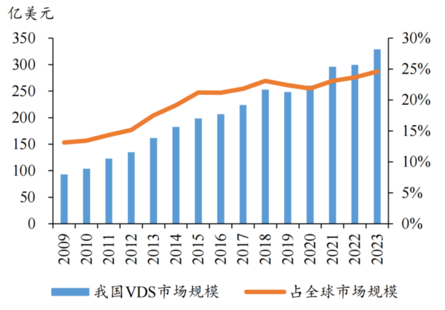 圖3 2009-2023 年我國 VDS 市場規(guī)模及占比
