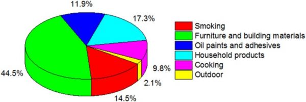 研究發(fā)現(xiàn),西安市室內(nèi)環(huán)境中,濃度較高的VOCs污染物有丙酮、甲醛、萘及二氯甲烷,室內(nèi)殺蟲劑、漂白劑、清潔劑、裝修材料和家具是其主要的排放源。其中,甲醛是最主要的室內(nèi)有毒VOCs物質(zhì),盡管其排放濃度低于國(guó)家室內(nèi)空氣質(zhì)量標(biāo)準(zhǔn)(100 μg·m-3),但長(zhǎng)期暴露仍會(huì)對(duì)人體健康構(gòu)成較大風(fēng)險(xiǎn)。室內(nèi)裝修材料和家具對(duì)VOCs濃度貢獻(xiàn)約為44.5%,油漆和膠黏劑貢獻(xiàn)約為11.9%,清潔劑貢獻(xiàn)約為17.3%,烹飪?cè)簇暙I(xiàn)約為9.8%,吸煙貢獻(xiàn)約為14.5%?;诿绹?guó)環(huán)保署VOCs對(duì)人體健康風(fēng)險(xiǎn)評(píng)估的標(biāo)準(zhǔn)計(jì)算方法,得出甲醛、1,3-丁二烯和1,2-二氯乙烷是致癌風(fēng)險(xiǎn)最高的三種VOCs污染物。