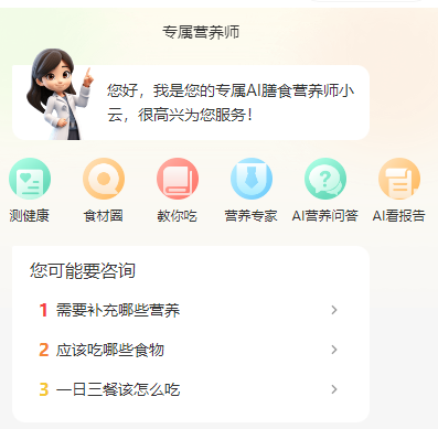 其中,AI營養(yǎng)師可實(shí)現(xiàn)為用戶建立健康檔案,從日常飲食、營養(yǎng)攝入、保健品推薦、健康預(yù)防、健康宣教等多方面服務(wù)用戶。
