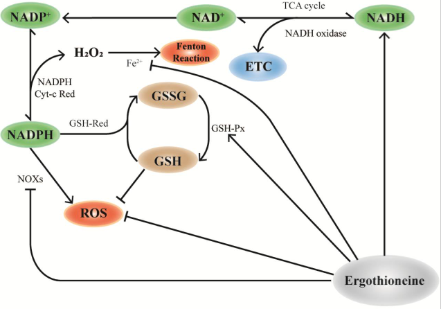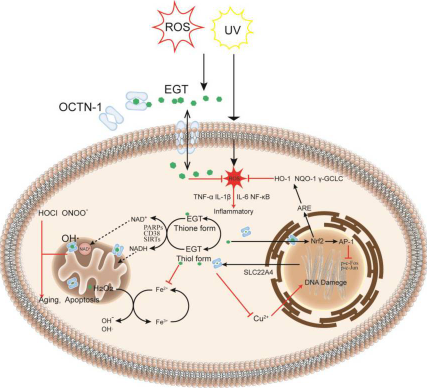 麥角硫因(EGT)作為身體抗氧化系統(tǒng)的一部分,可以作為一種后備手段,在損傷部位特異性地積累并發(fā)揮作用。