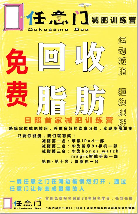 一、第一期招募,目標(biāo)肥胖人群,只限日照本地學(xué)院,報(bào)名費(fèi)為0元,每天上午,下午,晚上各一節(jié)課,可根據(jù)自己時(shí)間來參訓(xùn)至少一節(jié),周期30天,周期內(nèi)每天記錄體重,并根據(jù)減重排名在最后一天頒發(fā)獎(jiǎng)項(xiàng),訓(xùn)練期間有海邊拉鏈,戶外跑海等多種娛樂活動(dòng)。