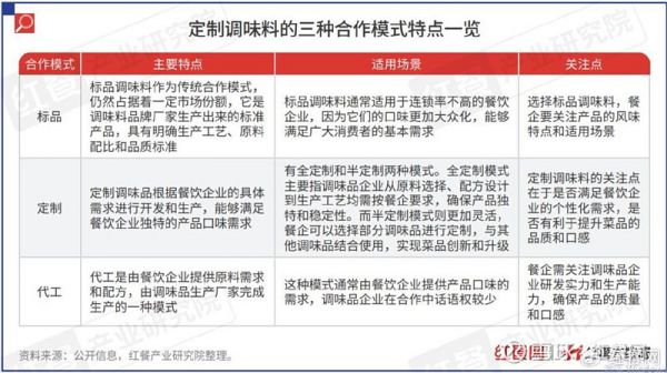 當下調味料企業(yè)和餐飲企業(yè)的合作模式主要有三種:定制、標品和代工。定制模式能滿足餐企獨特的口味需求,但可能需要較大的研發(fā)投入;標品模式則成本較低,但口味較為普遍,缺乏個性化;而代工模式則結合了定制和標品的優(yōu)點,既能根據(jù)餐企需求進行生產(chǎn),又能有效降低成本,但調味品企業(yè)在合作中的話語權相對較小。