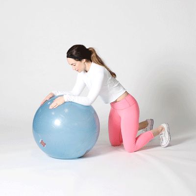 雙手趴在球上,從屈腿跪姿開始。將腿打直的時候身體往前稍微前傾挪動,看起來像是在瑜伽球上做平板支撐。這個動作對核心訓(xùn)練效果比較好,而且容易上手。