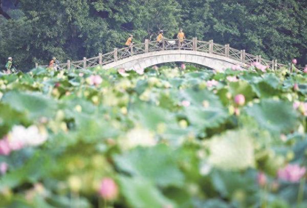 盛夏,自行車愛好者在建寧縣均口鎮(zhèn)修竹荷苑千畝蓮田花海騎行。 (新華社記者 宋為偉 攝)