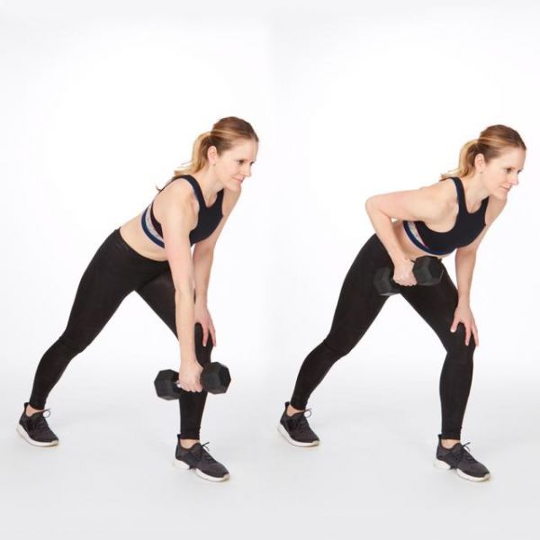站立,單手握住一個中等重量的啞鈴,雙腳分開與臀部同寬,彎曲膝蓋,然后將臀部向后移,降低軀干直到與地面幾乎平行。將右手放在前面的墻上或穩(wěn)定的扶手上以保持平衡。