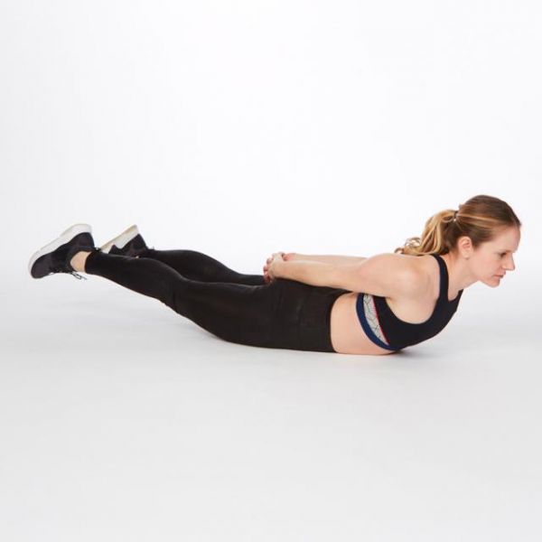 俯臥在地板上。抬起胸部,拱起背部,并將手放在背后。