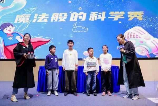 書籍是知識(shí)的海洋,魔法則是內(nèi)心的向往。壓軸出場(chǎng)的是實(shí)驗(yàn)?zāi)Хㄐ惚硌荨?蓸纷冄┍?、消失的水、瓶中彩虹、大小自如的氣球、無所不能的液氮......一環(huán)接一環(huán)的科學(xué)魔法秀如同一把神奇的鑰匙開啟了孩子們魔法的玄關(guān)。最后,實(shí)驗(yàn)秀老師聯(lián)合科技館玩偶"奇奇"和志愿者們?yōu)樵趫?chǎng)的所有媽媽們送上了一只代表母愛的玫瑰花。