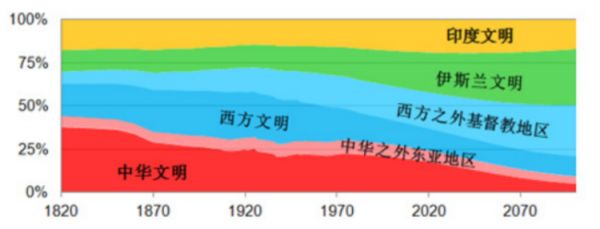 世界主要文明人口相對比例的變化趨勢(1820~2100年)