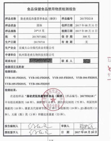 據(jù)了解,脂老虎營(yíng)養(yǎng)食品此次送檢的產(chǎn)品,經(jīng)過(guò)該中心對(duì)利尿劑、掩蔽劑、激素及代謝調(diào)節(jié)劑、糖皮質(zhì)激素等248項(xiàng)嚴(yán)格檢測(cè),均未檢出,確定食品的安全性。