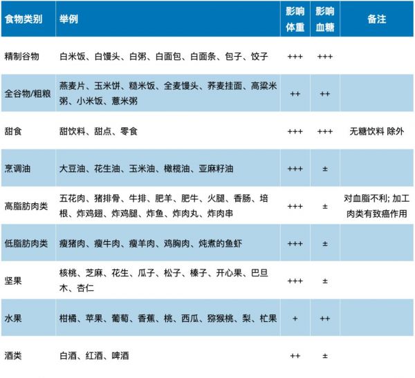 表 2-1 對(duì)體重/血糖影響較大的食物(±表示有一點(diǎn)點(diǎn)或沒有影響)