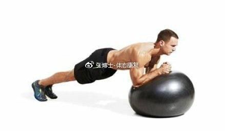 (2)瑜伽球+肘平板支撐:俯臥瑜伽球上,屈肘支撐,維持身體與瑜伽球的穩(wěn)定,此動(dòng)作做10次,每次保持30秒。