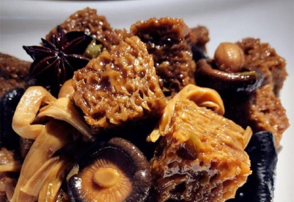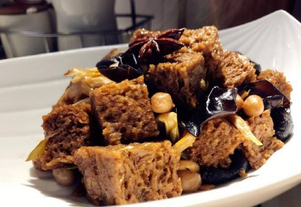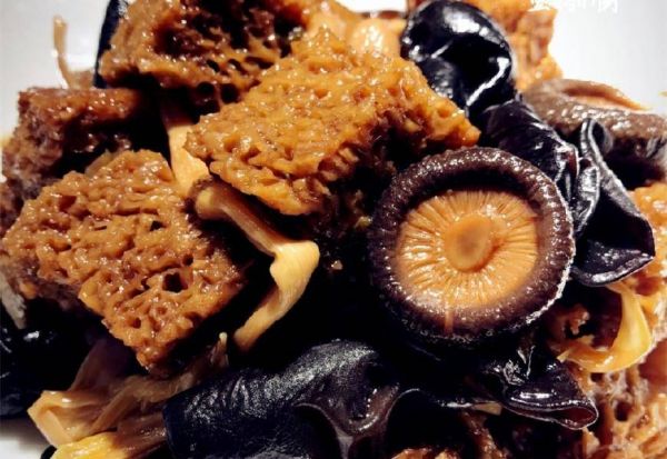資料:干烤麩、干香菇、干黃花菜、干黑木耳、干花生米、蔥、姜、大料、桂皮、3勺生抽、4勺老抽、2勺料酒、過量鹽、3勺醋、兩大塊冰糖、香油。