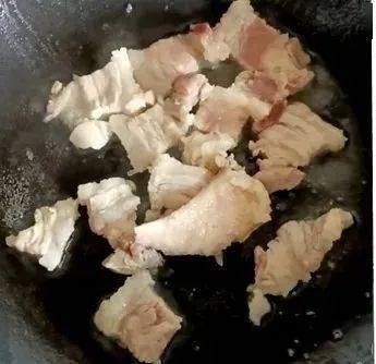 4、炒鍋上火,用豬油將蒜瓣爆香,加入五花肉翻炒一下。