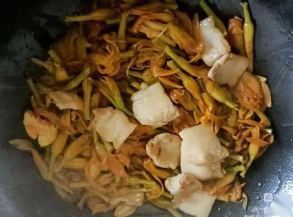 5、待五花肉稍微出油后,將黃花菜放入,翻炒片刻,稍加清水燜煮一下,用雞精調(diào)味即可起鍋食用。