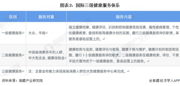 國(guó)際健康服務(wù)體系主要分為三級(jí),目前由于我國(guó)相關(guān)技術(shù)水平有限,主要是創(chuàng)建和完善一級(jí)、二級(jí)健康服務(wù)。一級(jí)服務(wù)主要針對(duì)大眾、平民,主要服務(wù)內(nèi)容包括建立健康檔案、健康評(píng)估、識(shí)別和控制健康危險(xiǎn)因素等。二級(jí)服務(wù)則主要針對(duì)中高端消費(fèi)水平的人群、中大型企業(yè)、健康保險(xiǎn)業(yè),主要進(jìn)行高層面的服務(wù)。三級(jí)健康服務(wù)則主要由有能力承擔(dān)高端消費(fèi)人群的大型健康服務(wù)中心來(lái)完成。