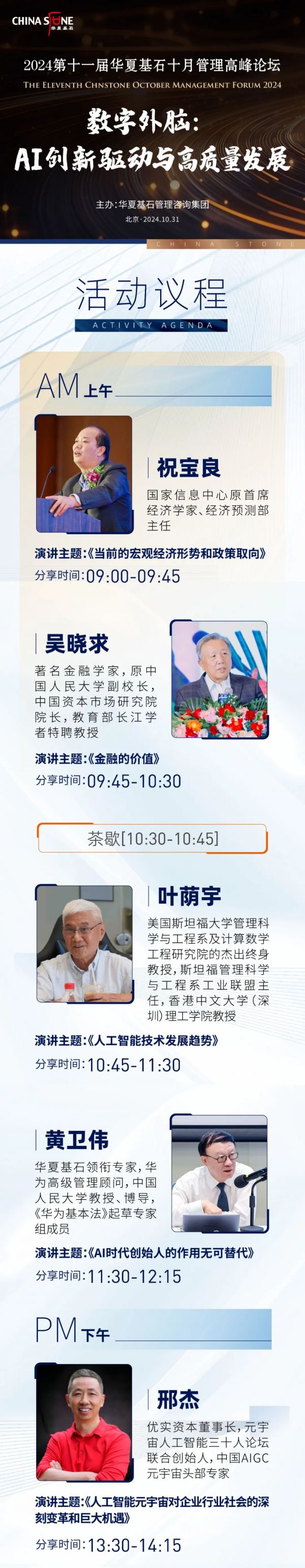 10月31日(周四),2024第十一屆華夏基石十月管理高峰論壇——《數(shù)字外腦:AI創(chuàng)新驅(qū)動(dòng)與高質(zhì)量發(fā)展》,北京開幕!屆時(shí),期待與您相聚,企業(yè)家精神與創(chuàng)造勇氣,不斷涌現(xiàn)。