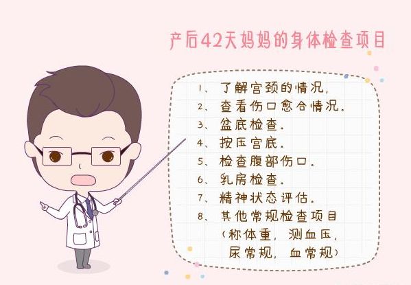 產(chǎn)后的健康檢查是在分娩后的42天,母嬰返院進(jìn)行更準(zhǔn)確的全身檢查和婦科檢查,孕媽檢查項(xiàng)目大致有: