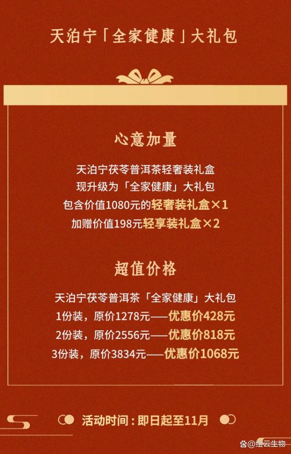今次,繪云生物誠意推出中秋國慶“全家健康”大禮包,購買天泊寧茯苓普洱茶輕奢裝禮盒,加送輕享裝,以茶為禮,為全家老中青三代人的健康添加動力。
