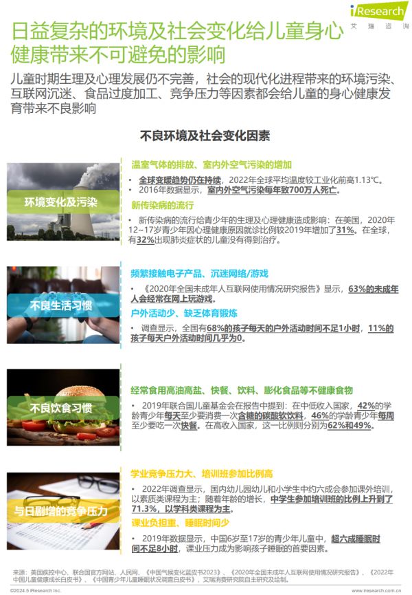 l 兒童身心健康問題日益突出:隨著社會的現(xiàn)代化進程,兒童面臨著環(huán)境污染、互聯(lián)網(wǎng)沉迷、競爭壓力等多重挑戰(zhàn),導致營養(yǎng)不足、肥胖、過敏、近視、心理障礙等問題高發(fā),影響兒童的身心健康發(fā)展。