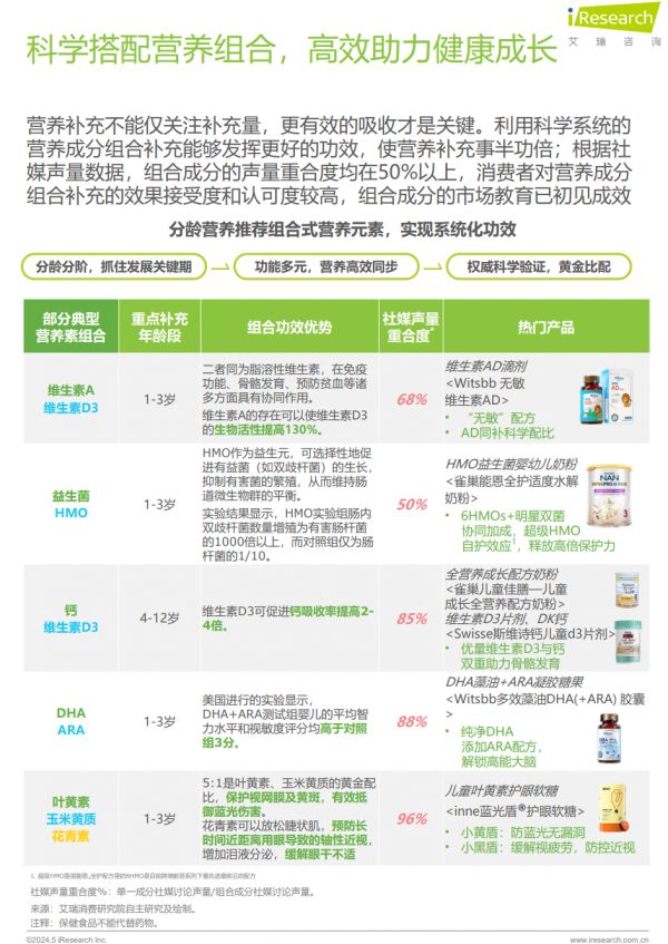 l 分齡營養(yǎng)補充需求旺盛:新生代家長對兒童營養(yǎng)品的需求全面且具有針對性,根據(jù)兒童的成長階段和身心發(fā)育特點,選擇合適的營養(yǎng)素和產(chǎn)品進行補充,以解決或預防兒童的健康問題,促進兒童的健康成長。