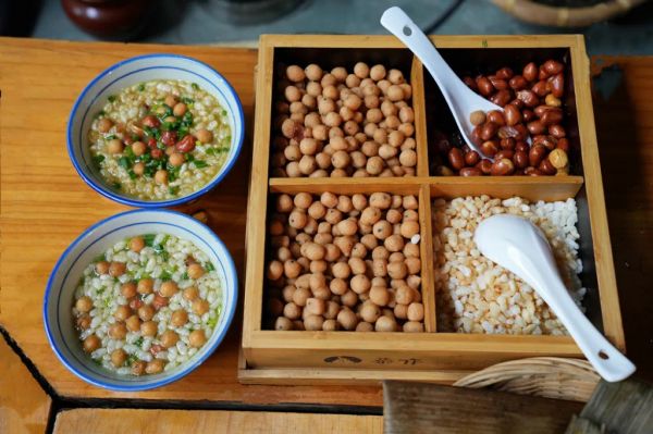 恭城油茶制法特別講究,選用清明、谷雨兩個(gè)時(shí)節(jié)采摘的茶葉,先用少許開水浸泡5~10分鐘,以減少煙火味及苦澀味,然后在茶鍋內(nèi)放少許豬油燒熱,放入姜、蒜及泡好的茶葉稍炒,隨即將其捶茸,捶好后加水燒開熬至出味,放入精鹽調(diào)味,用竹漏斗把茶水分別濾入碗中,撒入蔥花、香菜末,隨配用小碟裝好的米花、脆果(類似油炸的面疙瘩)、酥花生、炒米、炒黃豆、排散上桌即成。制好的恭城油茶,端上桌后,首先聞到一股蔥花、香菜特有的香味,進(jìn)口后初覺是茶葉的清苦,過(guò)后便是甘醇鮮香,令人回味無(wú)窮。一鍋茶水被飲完后,還可向鍋內(nèi)摻入清水熬煮,如此重復(fù)熬煮可達(dá)五六鍋。這樣油茶一鍋一鍋煮下來(lái),感覺味道已沒有先前的濃烈,這正應(yīng)驗(yàn)了油茶的“一杯苦、二杯呷(澀)、三杯四杯好油茶”之說(shuō)。