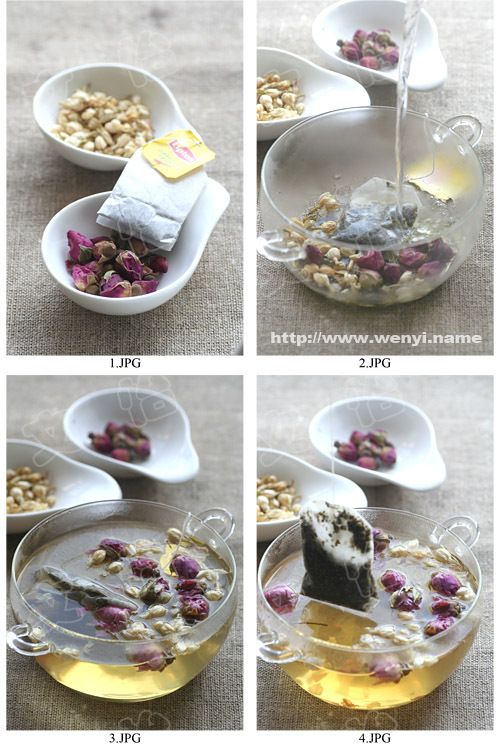 1)將綠茶包,玫瑰花,茉莉花放入碗中,倒入開水,浸泡5分鐘后,將綠茶包取出,否則綠茶的味道太濃重,會遮蓋掉玫瑰和茉莉的芳香。