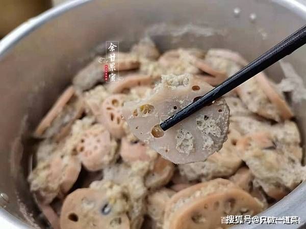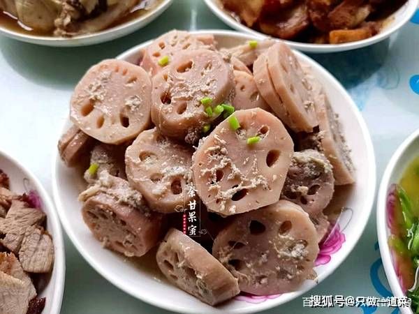 四、【鮮肉藕夾】蒸藕夾和扣肉,皆是當(dāng)?shù)匮鐣?huì)中必上的菜肴,家常制作沒(méi)有太多講究,擺盤(pán)隨意,制作過(guò)程加快,可以將豬肉夾于蓮藕盒上,然后入鍋燉煮即可,也可以蒸制。