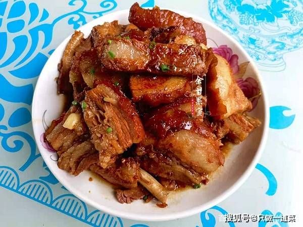 三、【過(guò)油肉】這種過(guò)油肉在當(dāng)?shù)匾卜Q(chēng)為扣肉,而且是虎皮的,從擺盤(pán)上來(lái)講,這一碟不算扣肉,但它也有另一個(gè)名字“散扣”。是用油炸后的五花肉,經(jīng)過(guò)浸泡、焯煮、切塊,腌制,燉煮成而,沒(méi)有擺入碗中,蒸制、倒扣,散塊燉制,所以稱(chēng)為“散扣”。