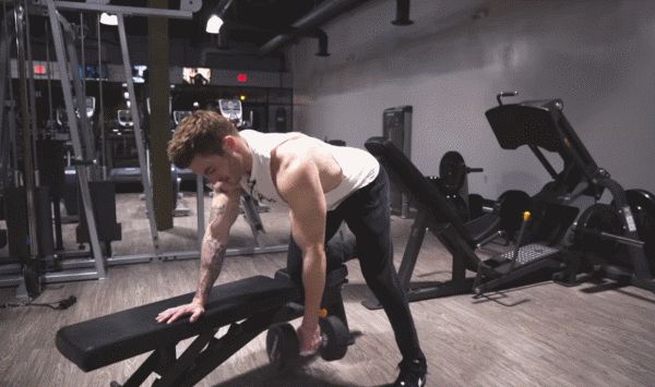 站姿平凳側(cè)方,一條腿支撐身體,另一條腿跪在凳子上,保持背部挺直,向前俯身至上半身幾乎與地面平行,內(nèi)側(cè)手臂撐在凳子上另一只手臂握住啞鈴自然下垂,保持身體穩(wěn)定,大臂夾緊,背部肌群發(fā)力帶動手臂后上方提起啞鈴至動作頂點稍停,收縮背部肌群,然后控制速度慢慢下放啞鈴至盡可能低的位置,從而讓背部肌群得到更加充分地伸展