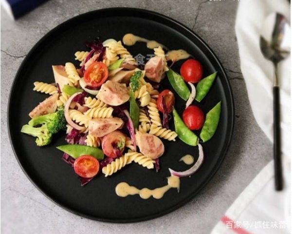 最后,把螺旋意面放入容器里,放入法式沙拉汁,番茄沙司,黑胡椒碎,白糖拌勻,盛入沙拉盤中即可享用了。